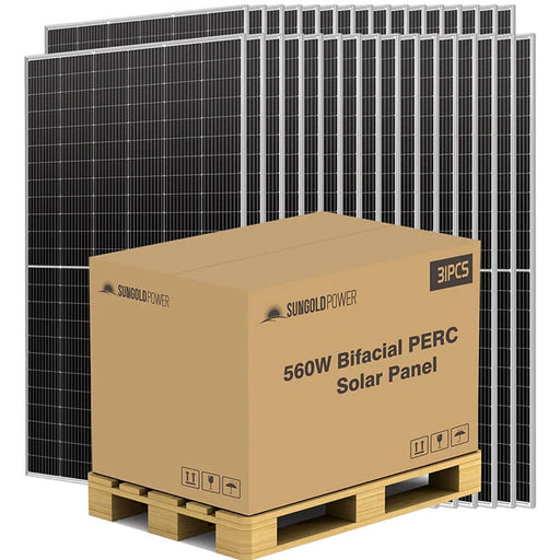 View full detailsSunGoldPower 560W Bifacial PERC Solar Panel Pallet The SunGoldPower 560W Bifacial PERC Solar Panel Pallet (31 panels) provides a high-efficie...