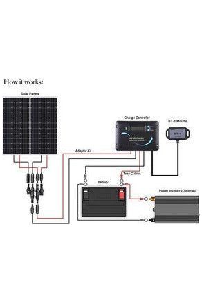 Renogy RV Kits are carefully arranged to meet your RV needs. Each Kit will include 1-4  100W 12V Monocrystalline solar panels (depending on the selected kit), one Adventurer 30A PWM Charge Controller, one 30ft 10AWG Solar Kit Adapter, one 16ft 10AWG Tray Cable, a BT-1 Bluetooth Module, and one Cable Entry Housing