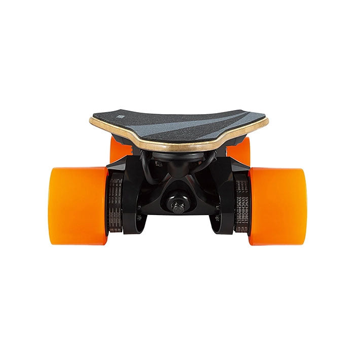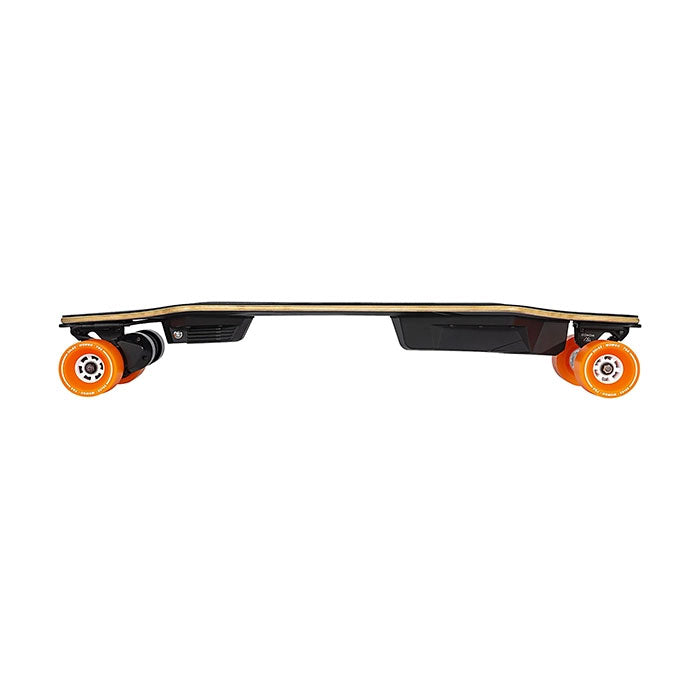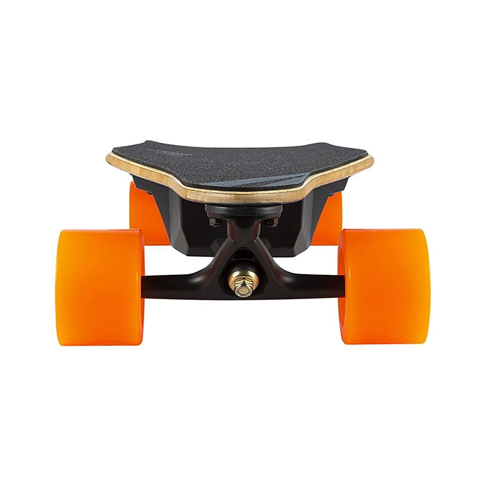 The deck is crafted from bamboo and fiberglass for a perfect balance of flex and durability, designed to reduce road vibrations while maintaining stability and strength. The board’s ergonomic shape, along with shock-absorbing griptape, ensures secure footing and comfortable ride dynamics over longer distances. Large 90mm wheels come standard, providing excellent grip and comfort, and can be swapped for larger wheels if preferred.