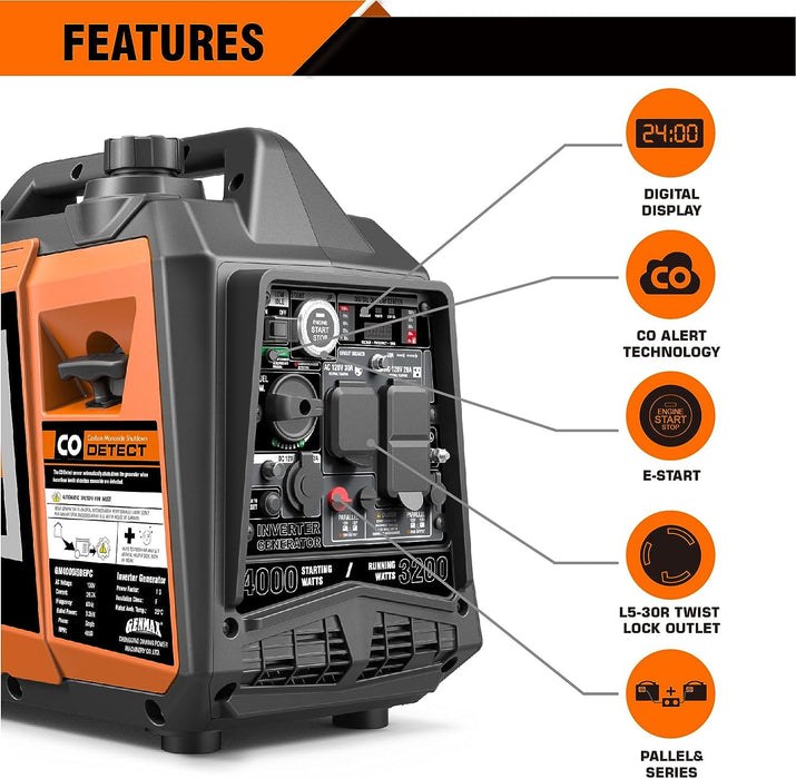 GENMAX GM4000iSBEPC 3200W/4000W 26.7 Amp Electric Start Gas Inverter Generator Parallel Ready with CO Detect New