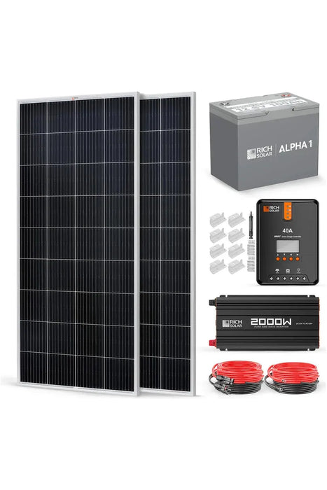 Our 400W 12V complete kit comes with all the products and components you need to start harnessing, storing and using the energy of the sun. This kit includes 2 high efficiency 200W Monocrystalline panel with 9 busbars, 40A MPPT controller, 2000W 12V inverter and a 100 AH 12V Lithium battery. Install this on your RV or tiny home and start your solar adventure today!