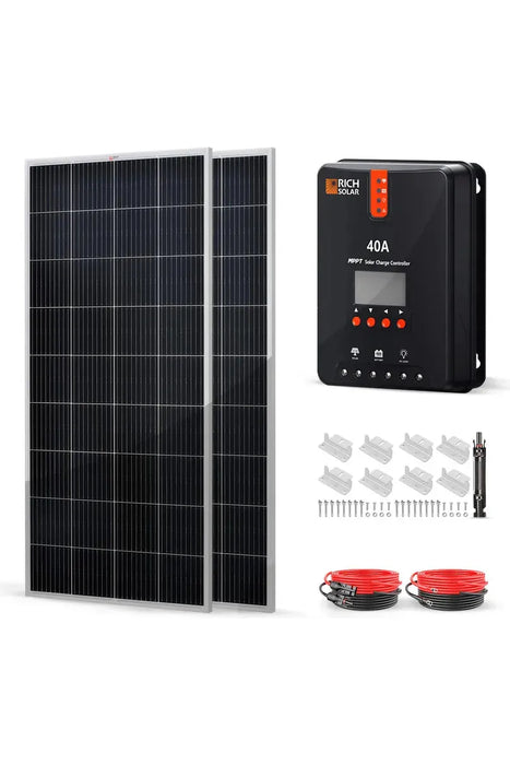 Our most popular 12V kit! This 400W kit contains 2 of our high efficiency 200W Monocrystalline panels with 9 busbars and our 40A MPPT controller that can be expanded to 600W on a 12V system. This kit can be paired with our 200AH 12V Lithium battery. For a quieter, more peaceful outdoor experience, go solar now and start powering your RV, boat or trailer!